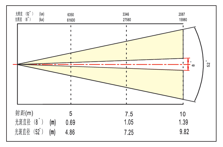 光学角度:50%光斑角度 8°-26°,100%光斑角度 15°-52°